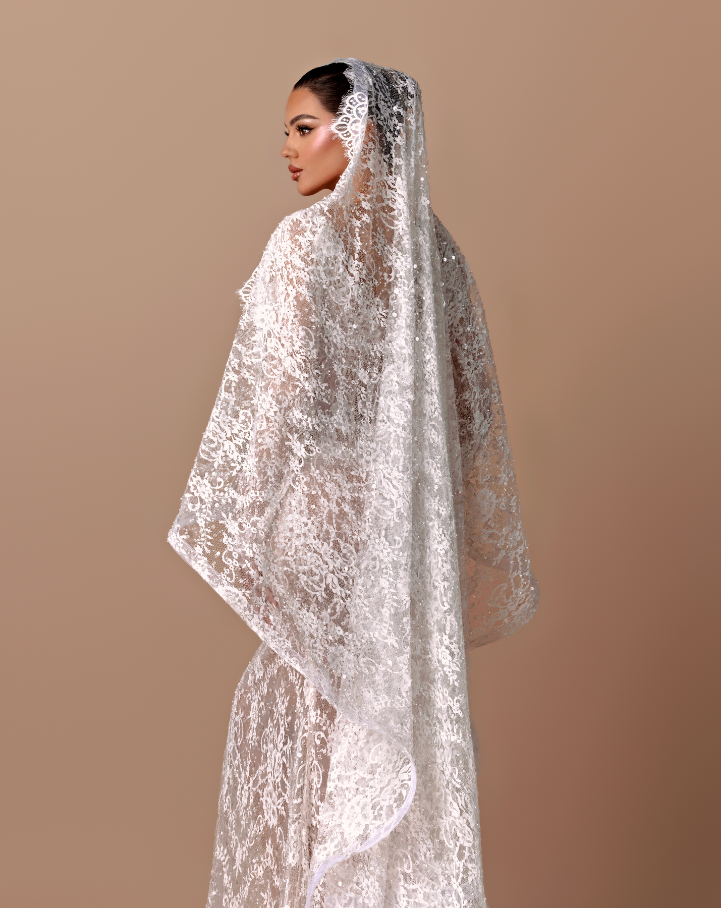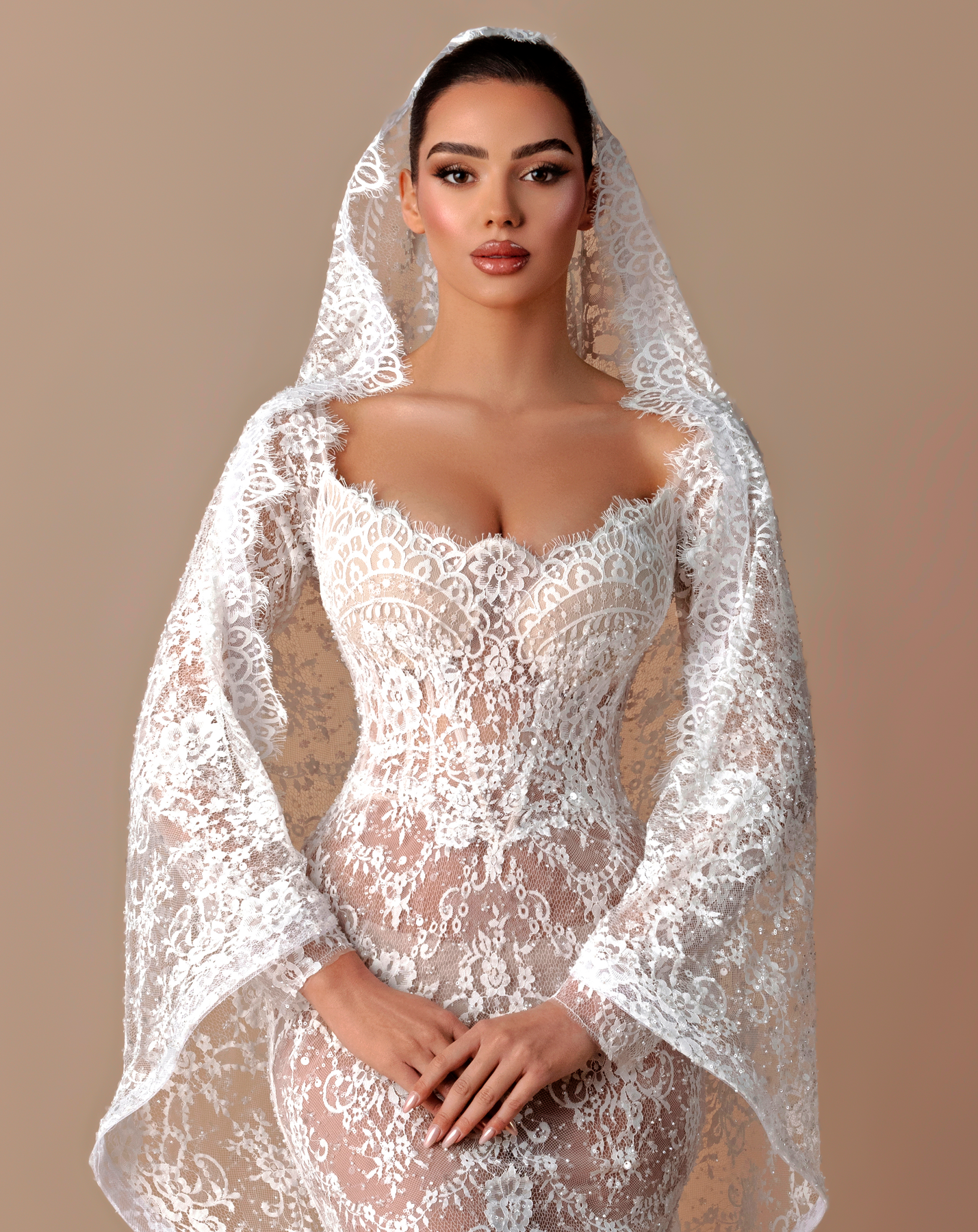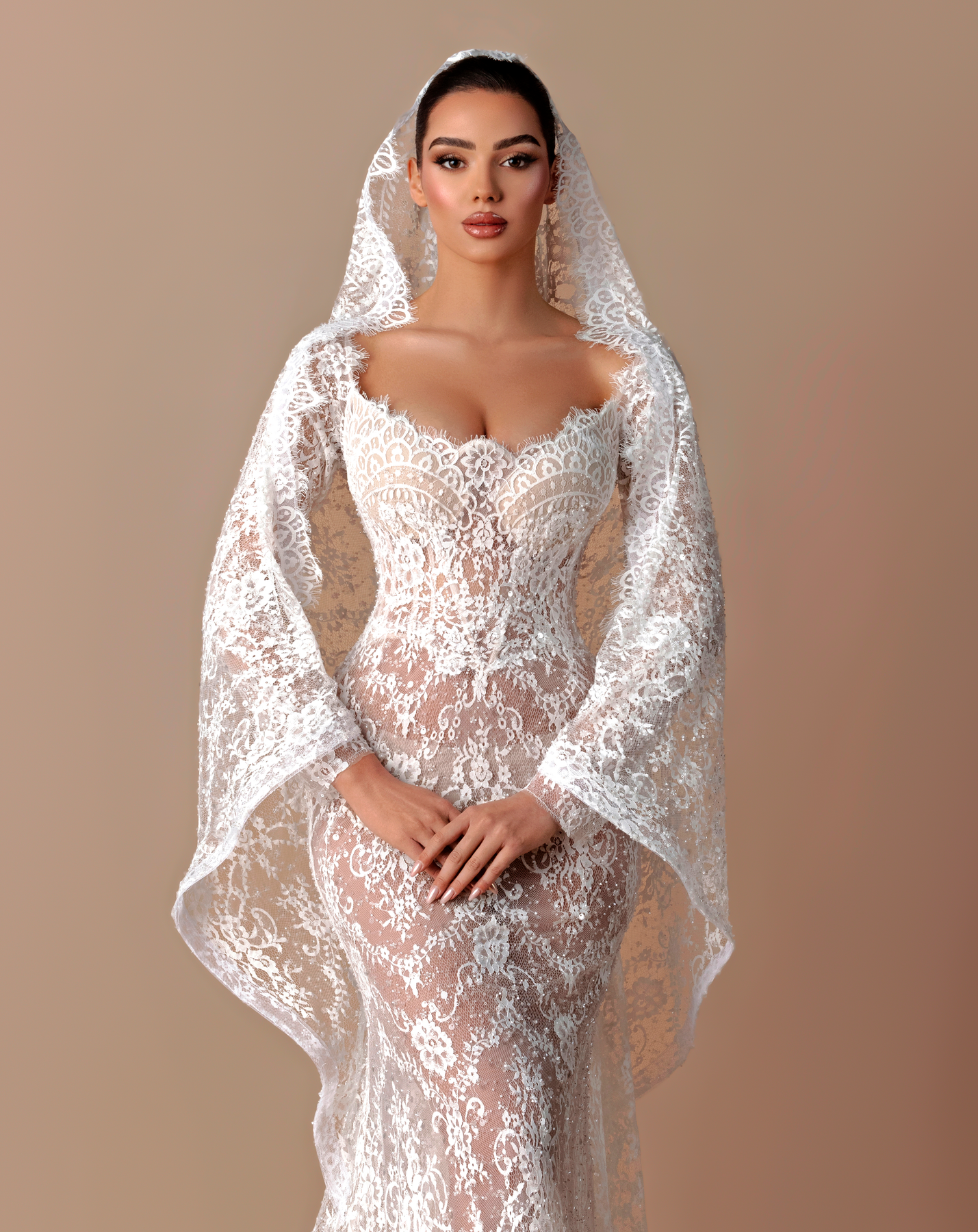 • Long-sleeve lace gown with a cathedral-style hooded veil