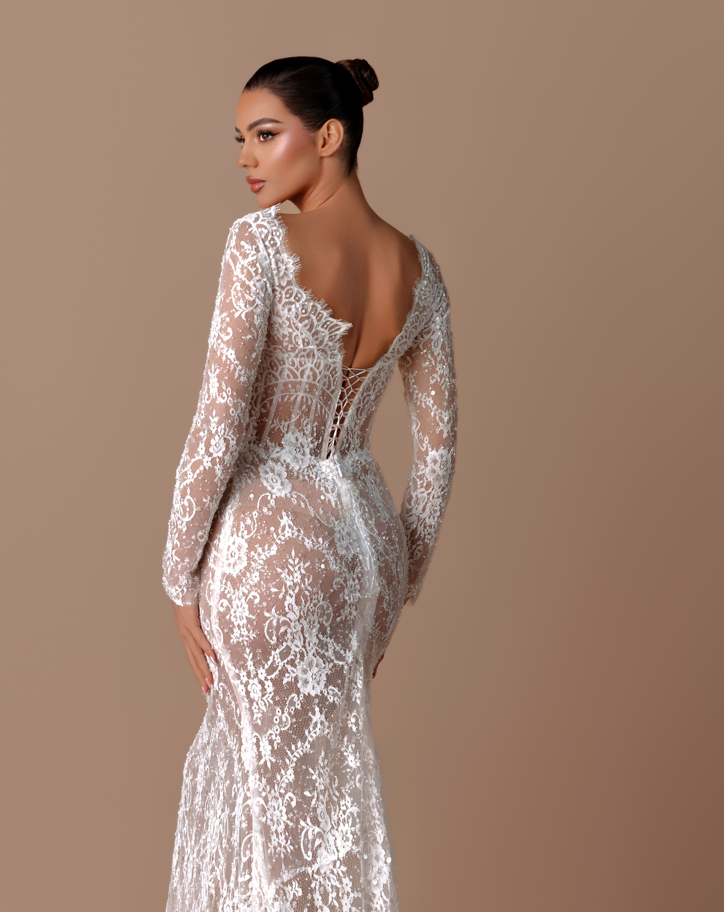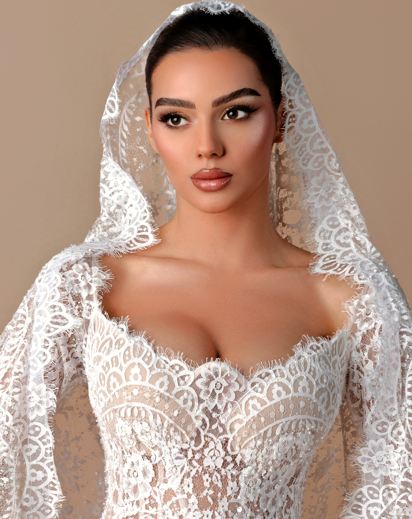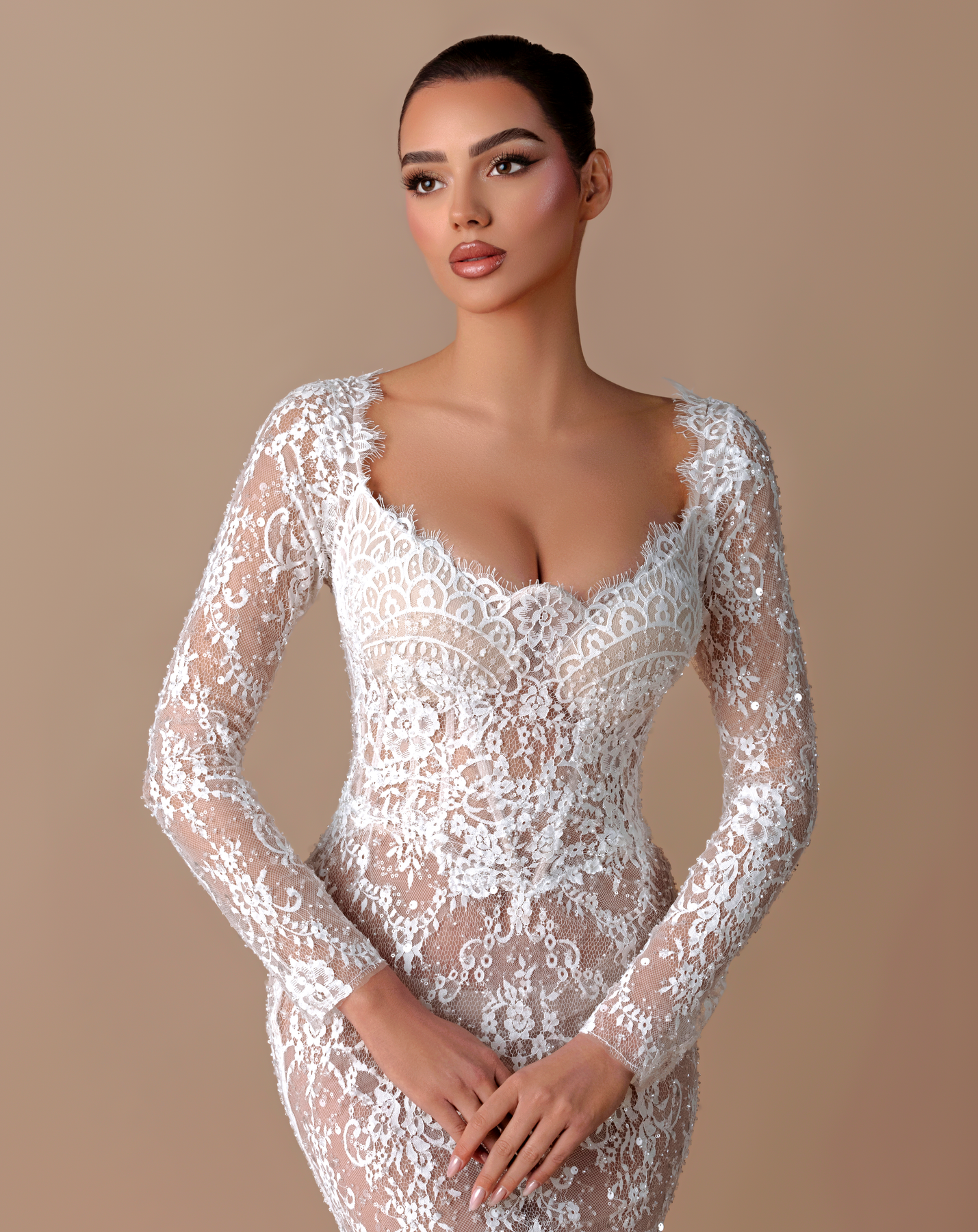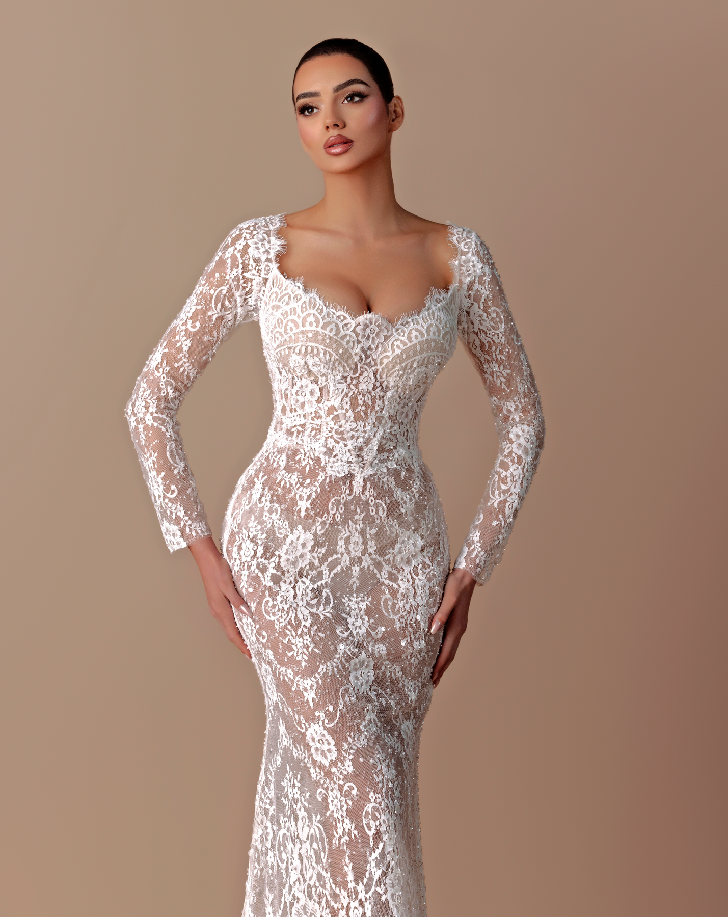 • Long-sleeve lace gown with a cathedral-style hooded veil