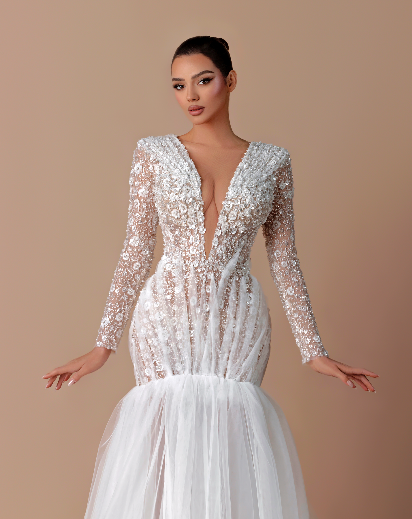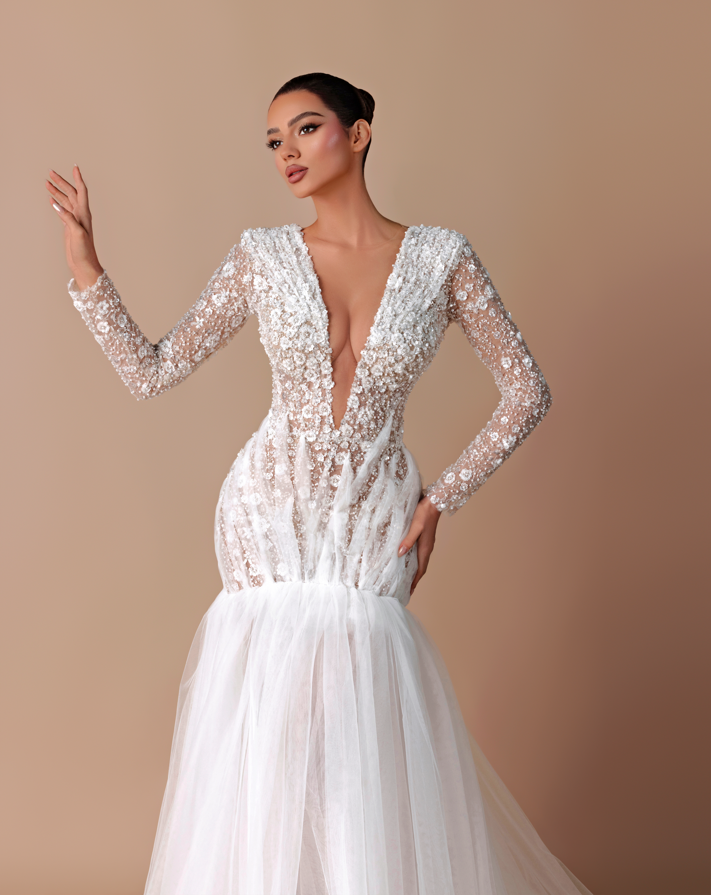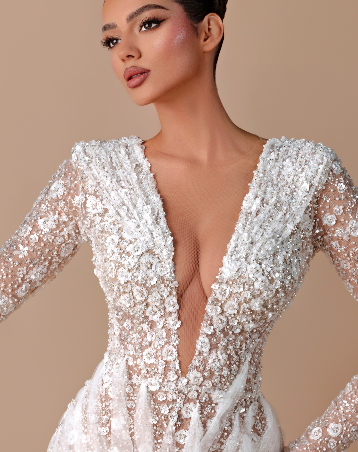 • Long-sleeve lace and beaded gown with a deep V-neckline