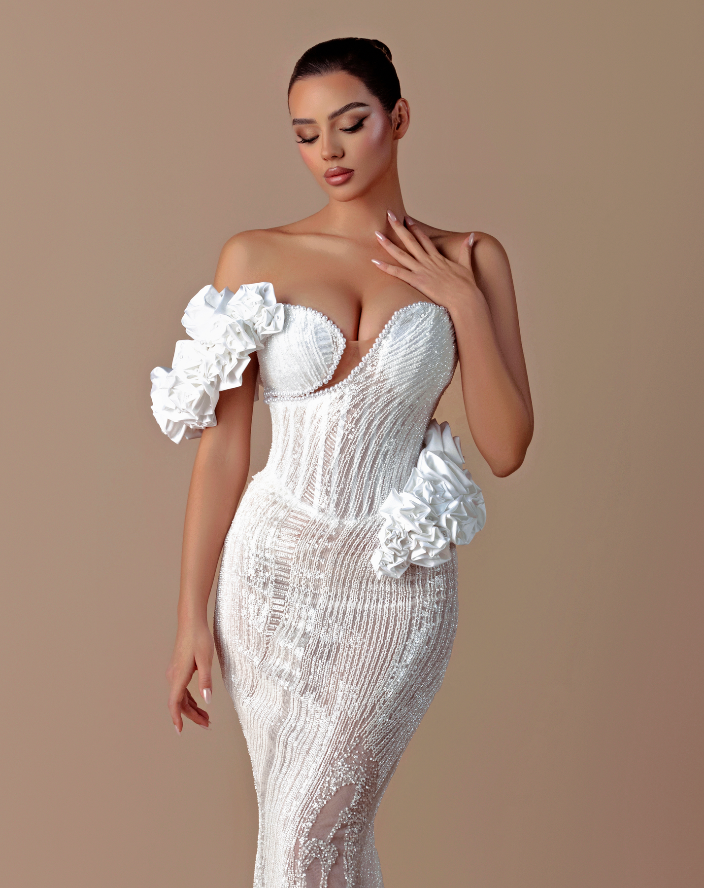 • Strapless corset gown with structured boning for a sculpted waist