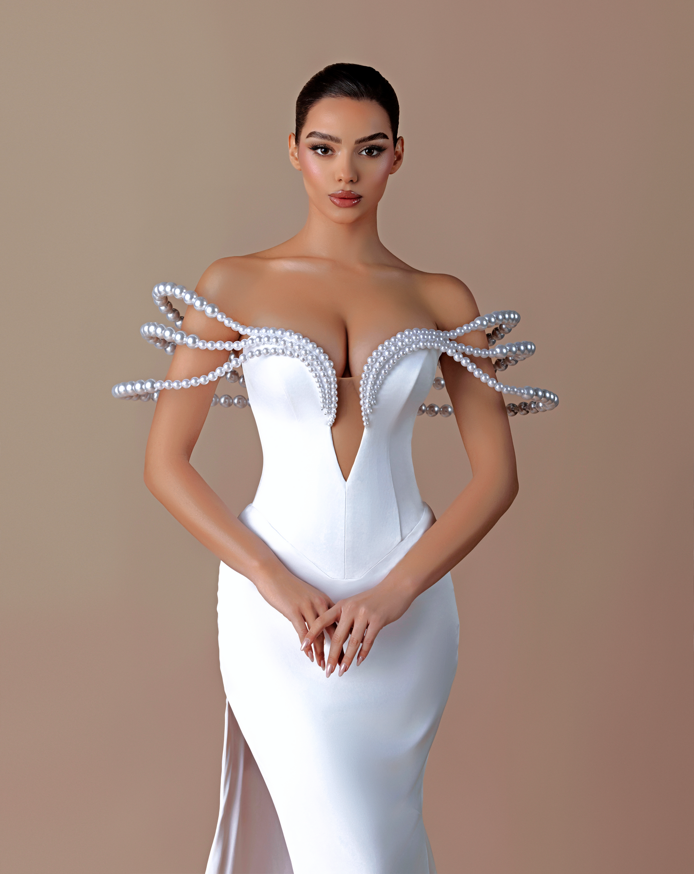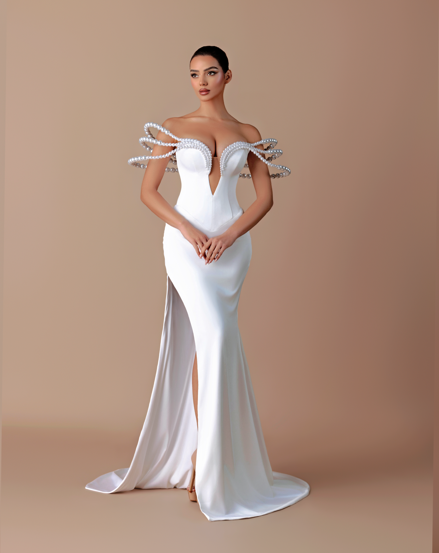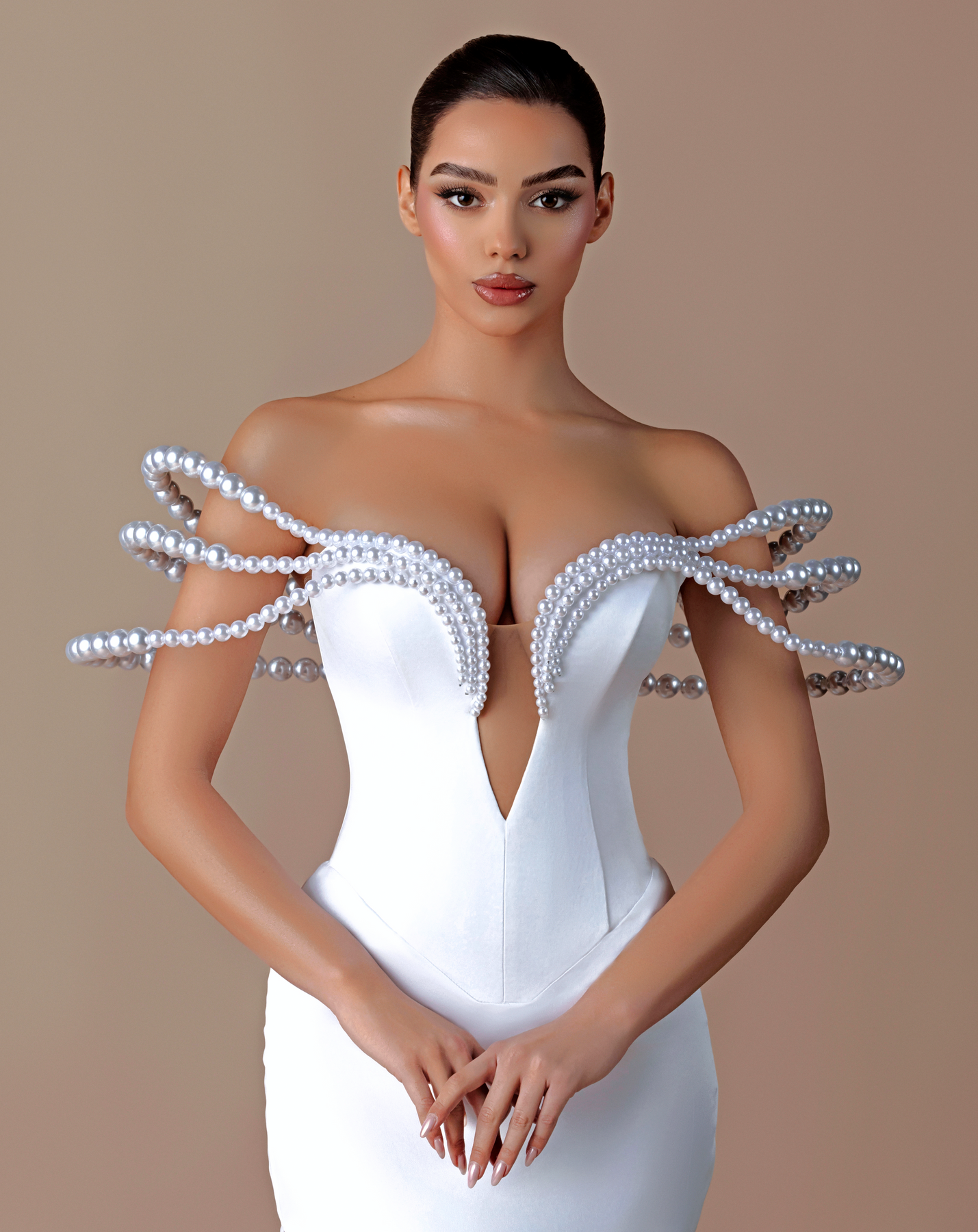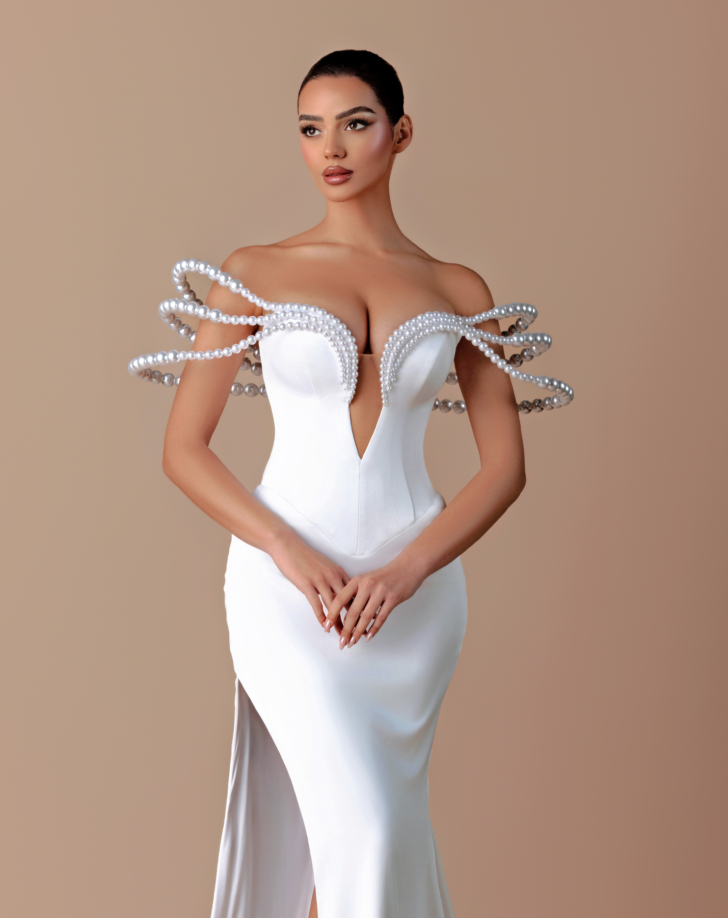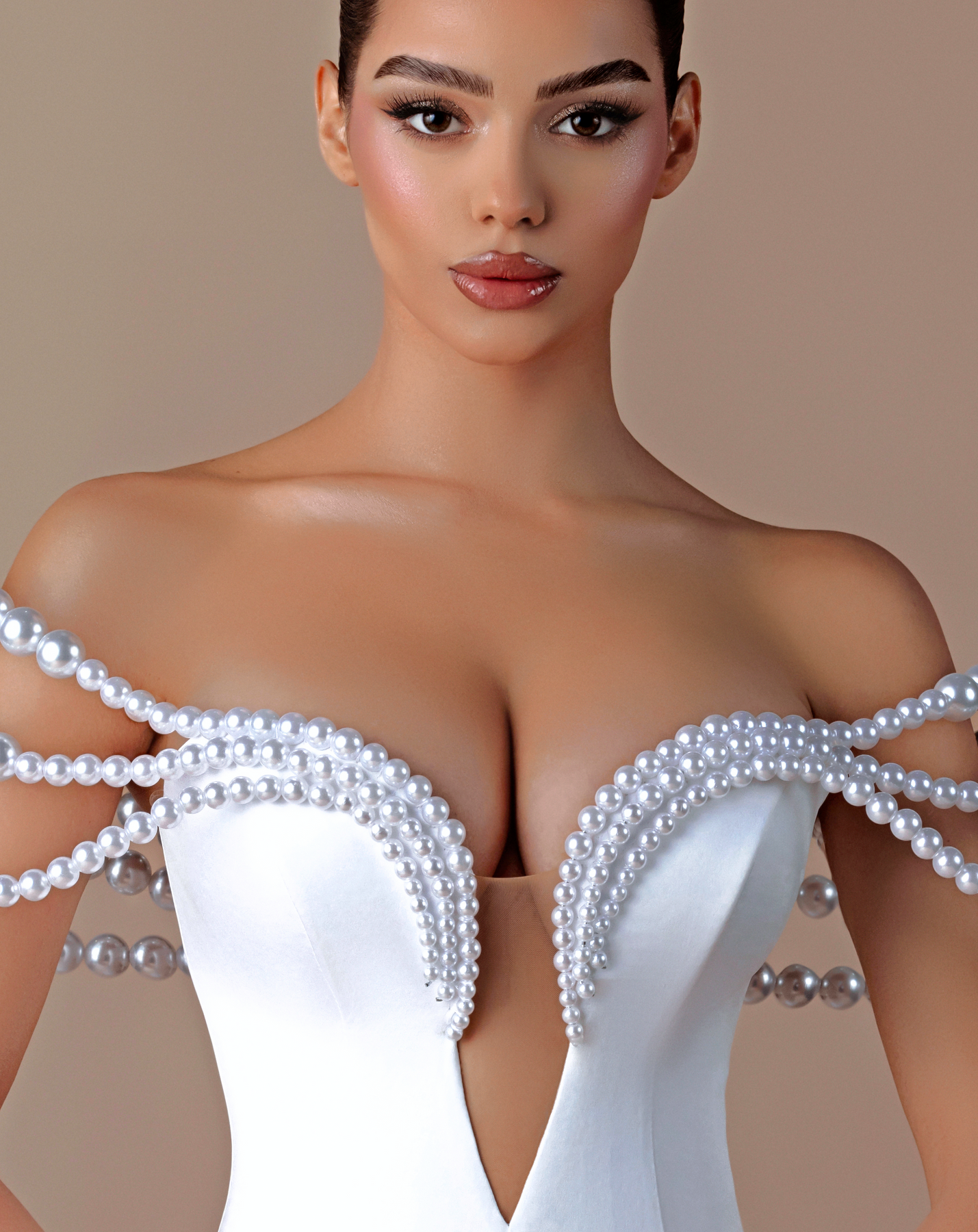 • Dramatic pearl-adorned looped straps creating a futuristic effect