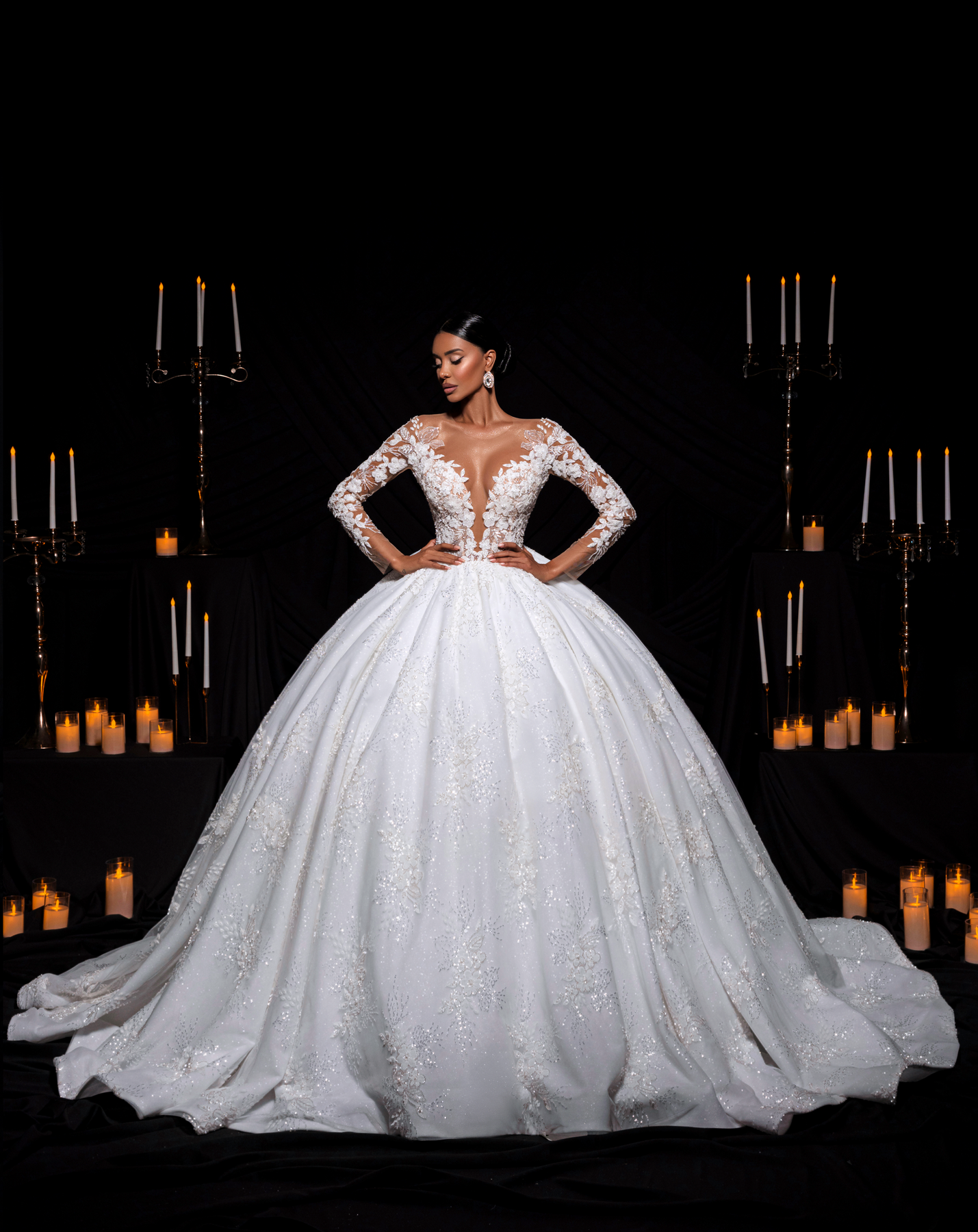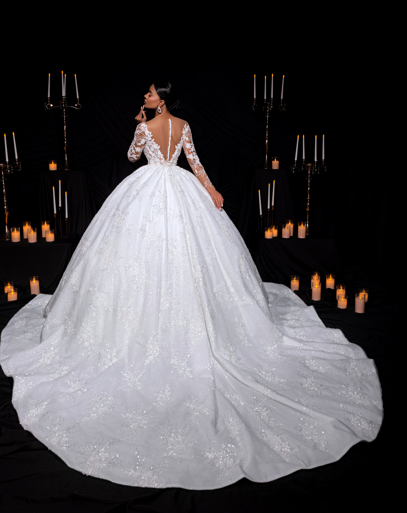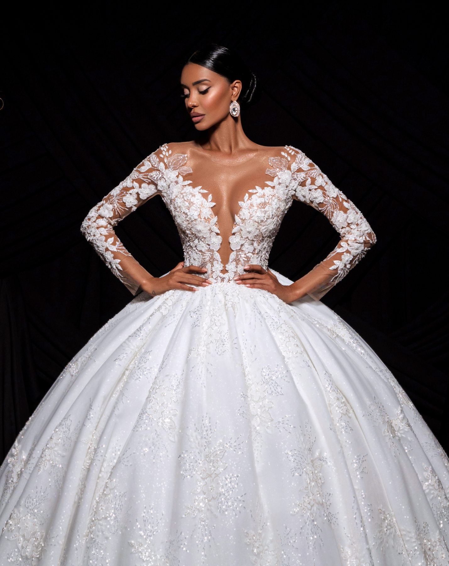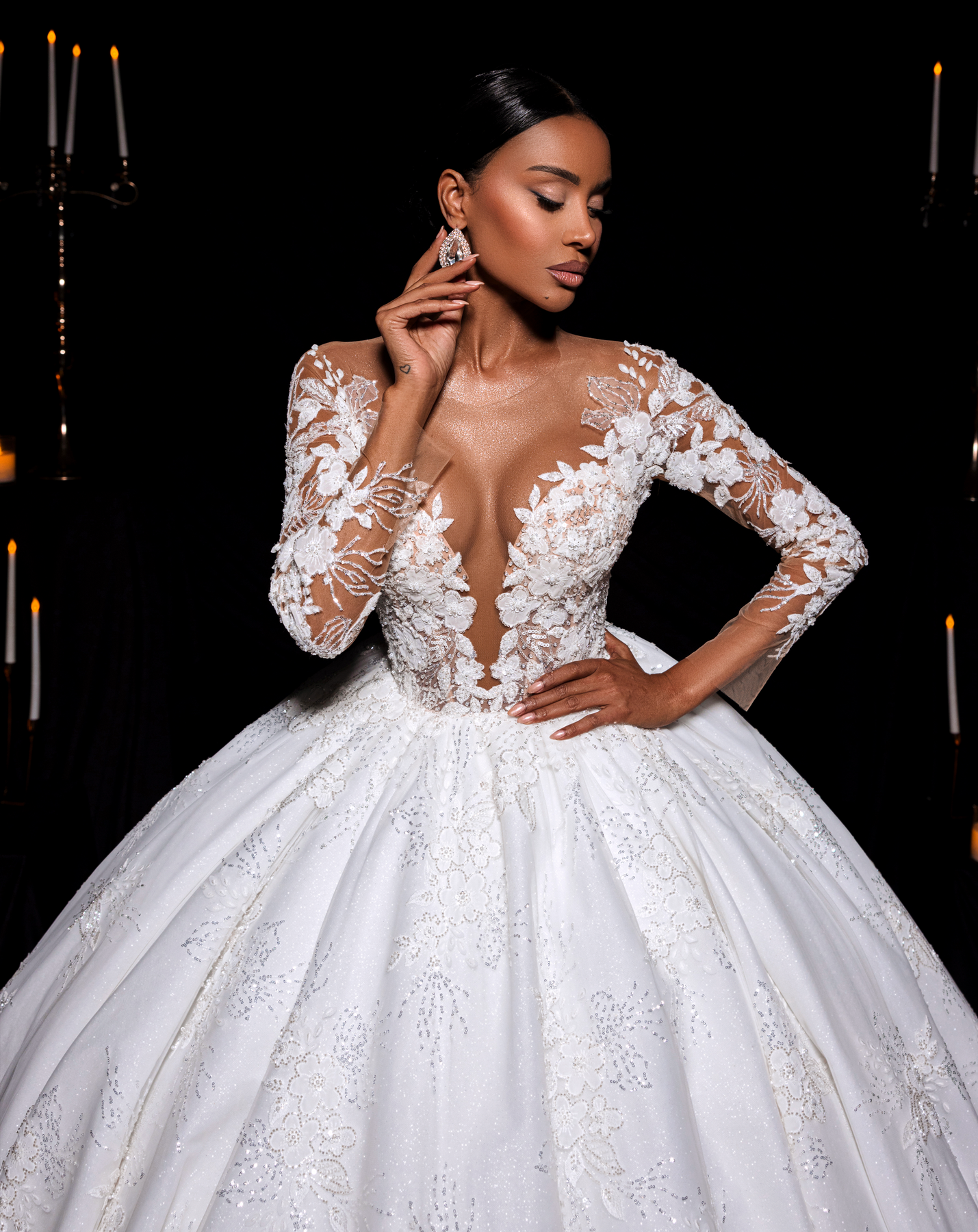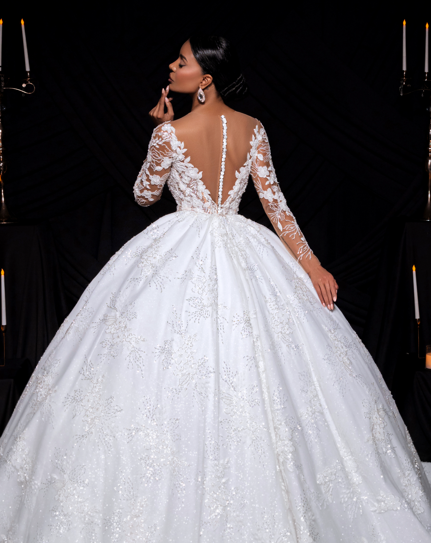 Long sheer sleeves with delicate floral appliques cascading onto the bodice