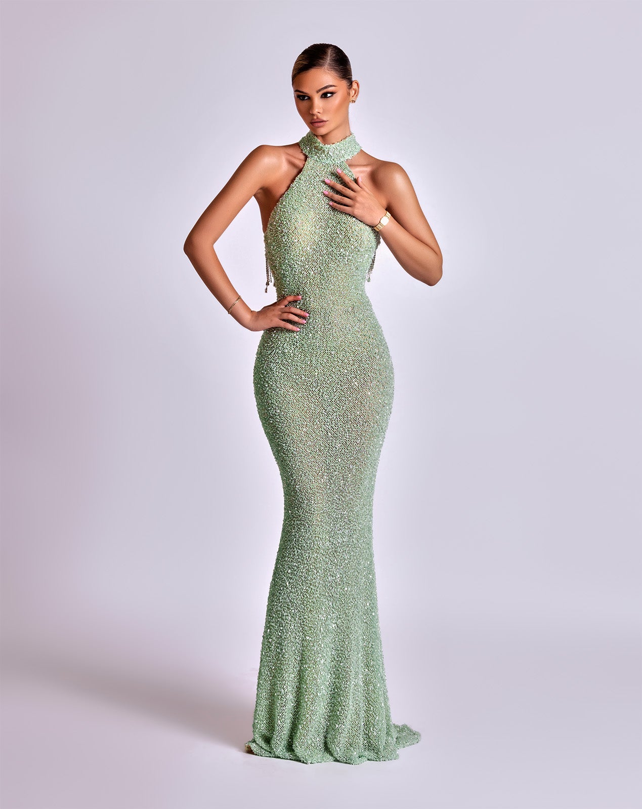 Sleeveless Mint Green Maxi Dress with Unique Neckline Nicol Sposa